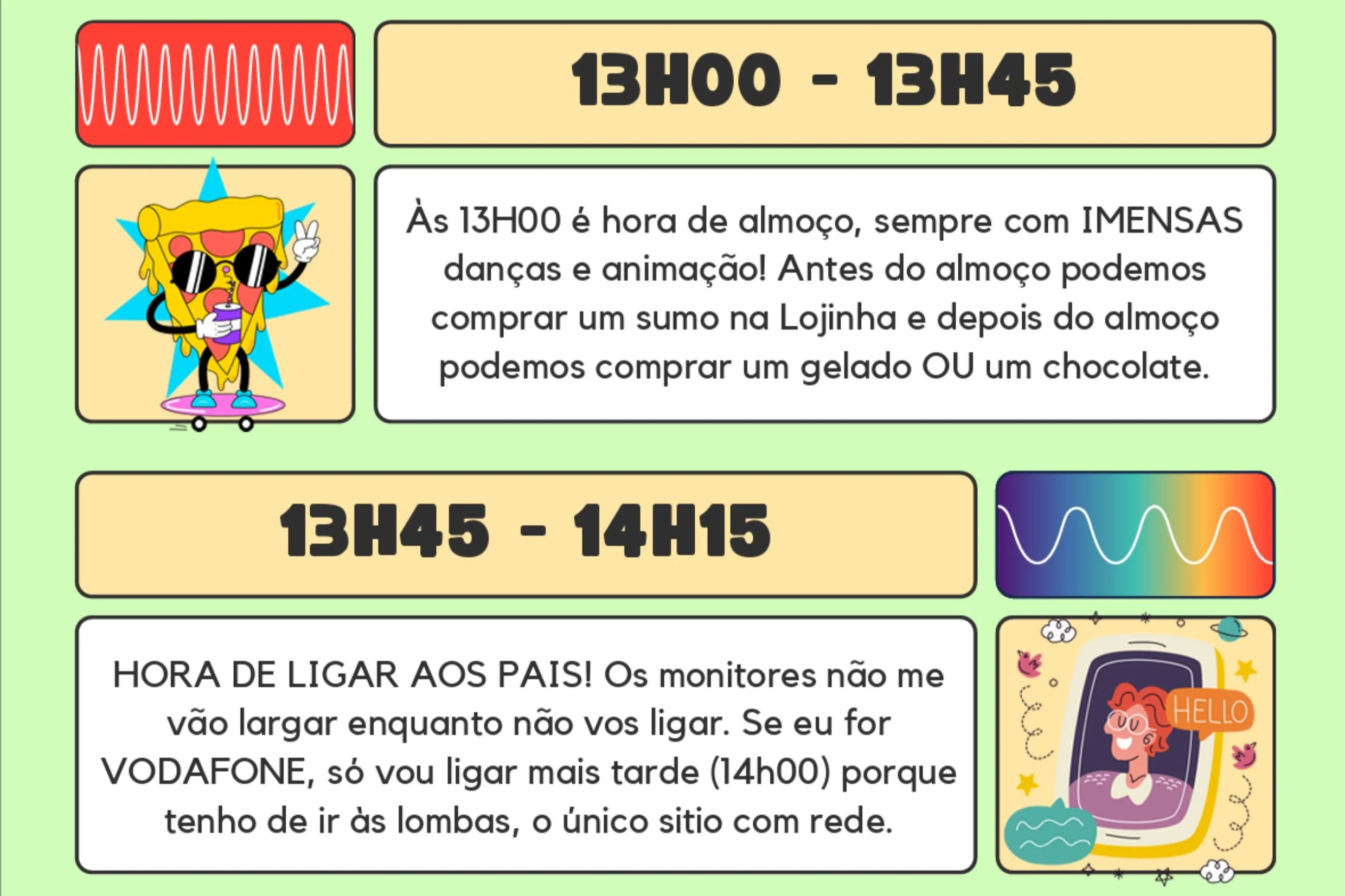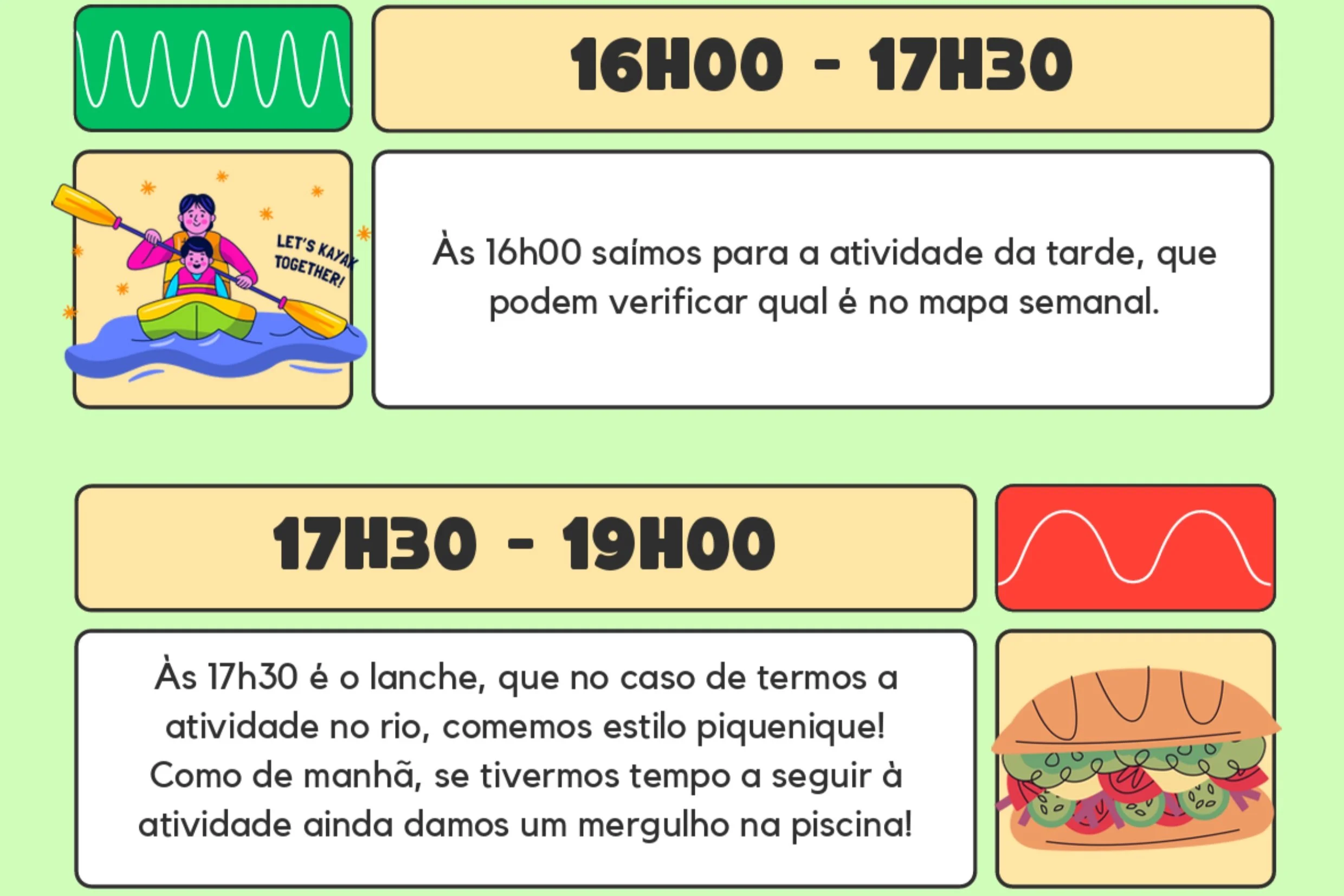 As nossas semanas de Colónias de Férias podem ter a duração de 7 ou de 14 dias e têm início no domingo, a partir das 16:00h e terminam no sábado seguinte, até as 10:00h.
